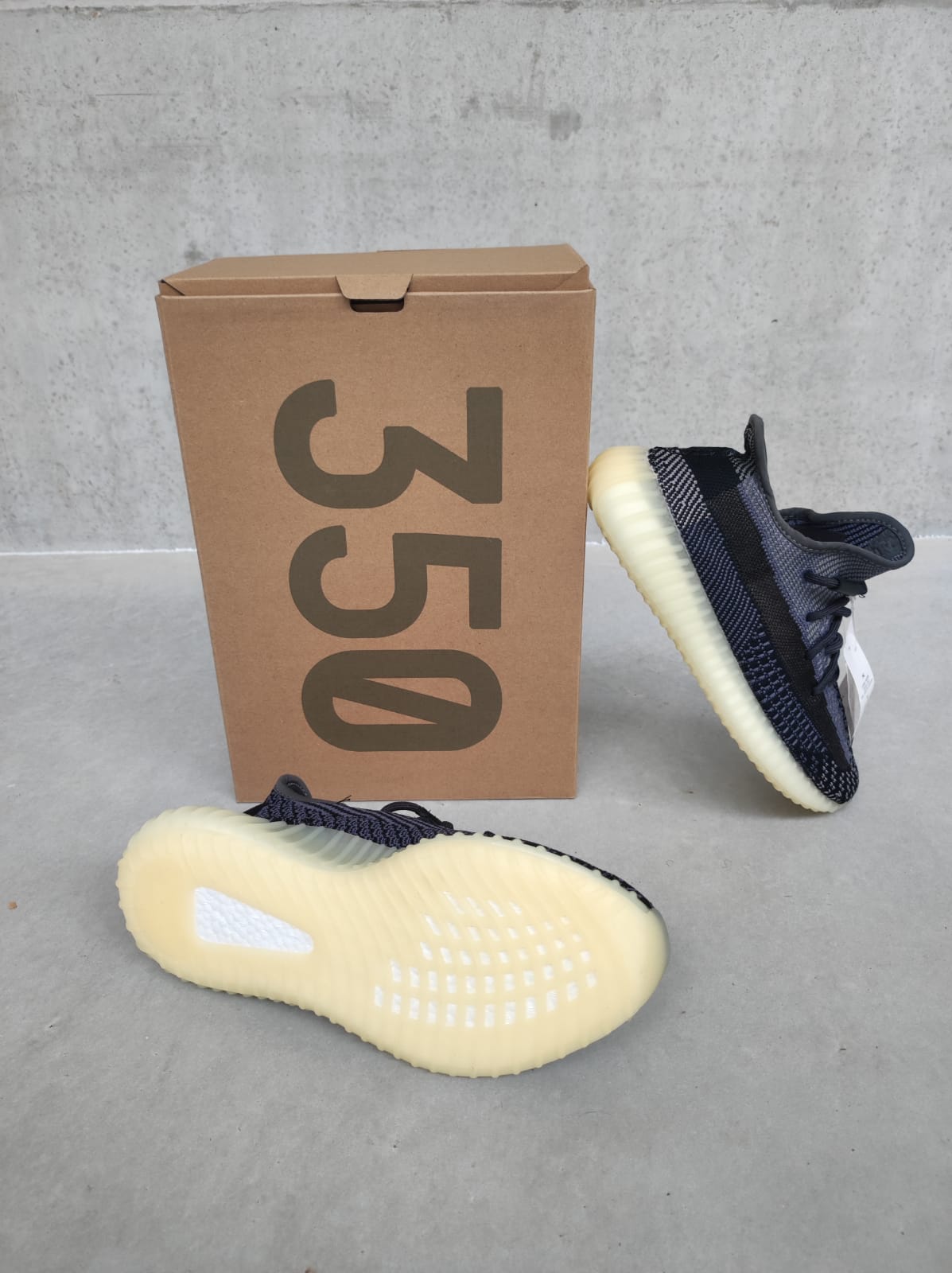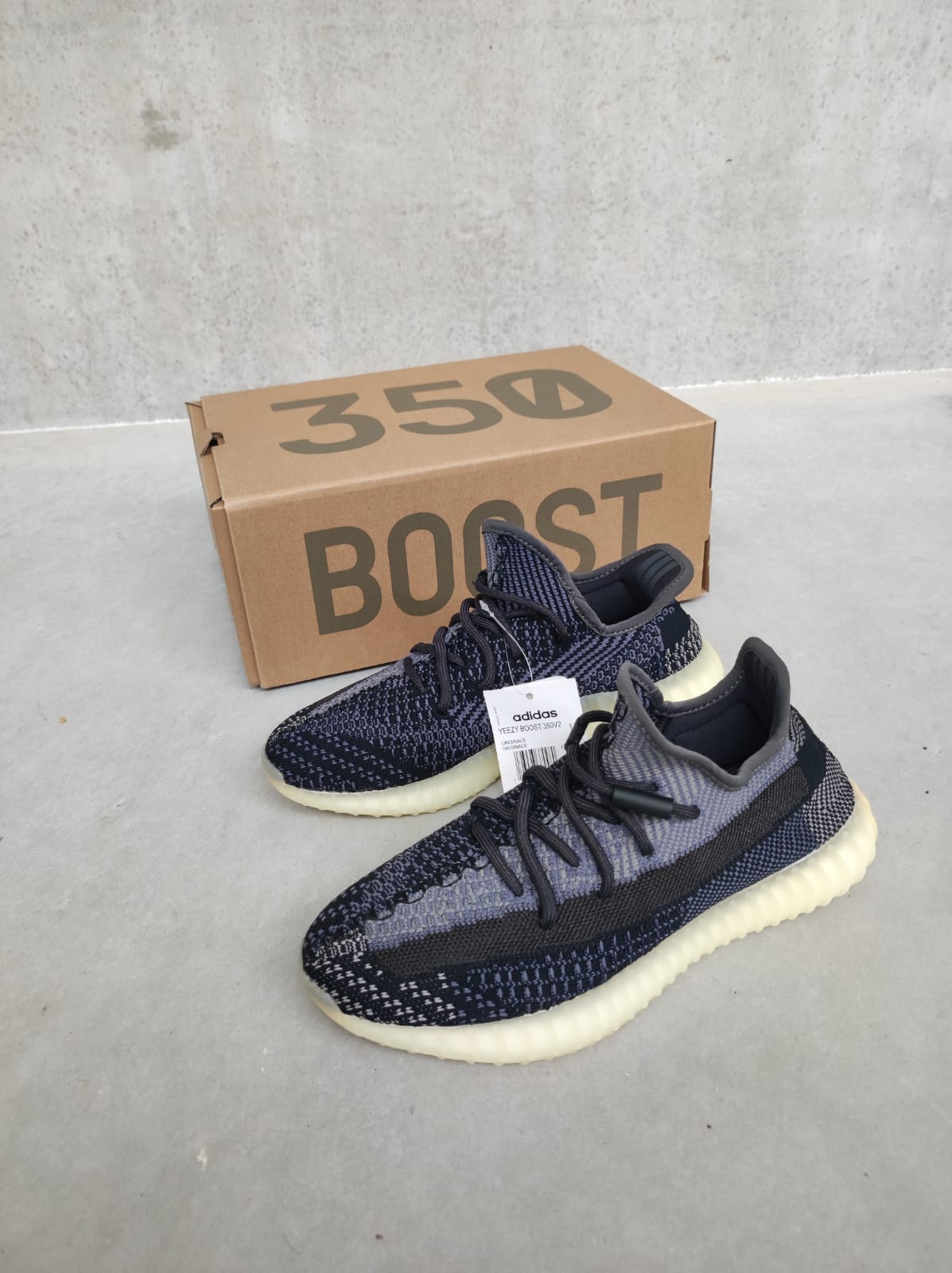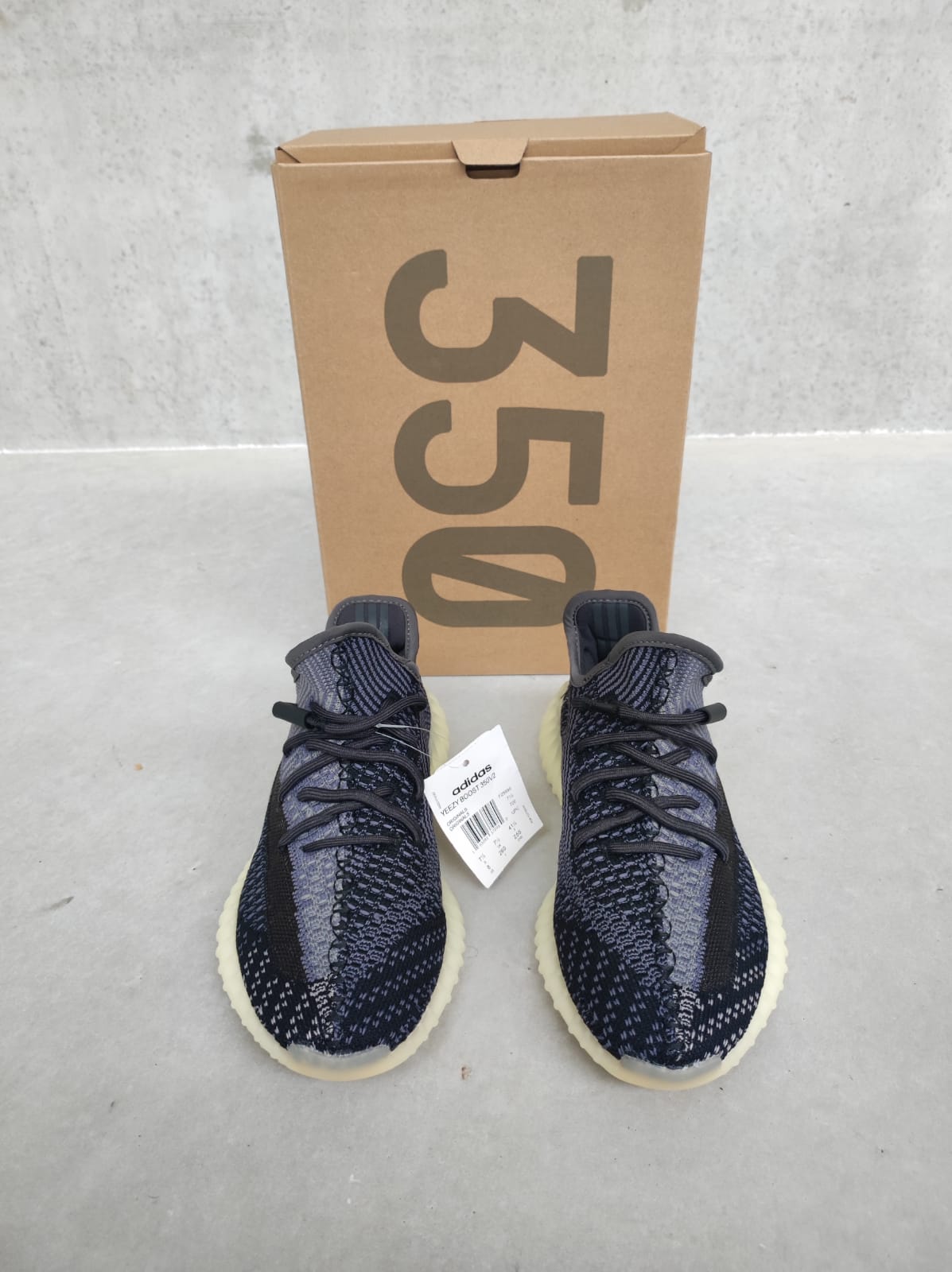 Adidas Yeezy Boost 350 V2 Carbon wordt geleverd met doos en alle toebehoren.