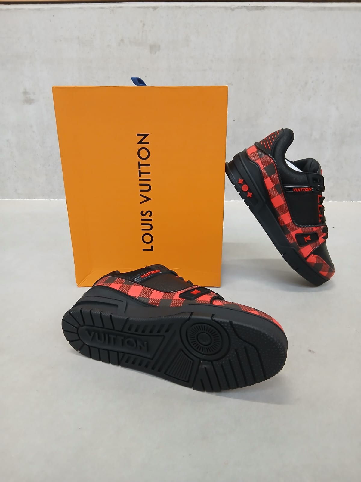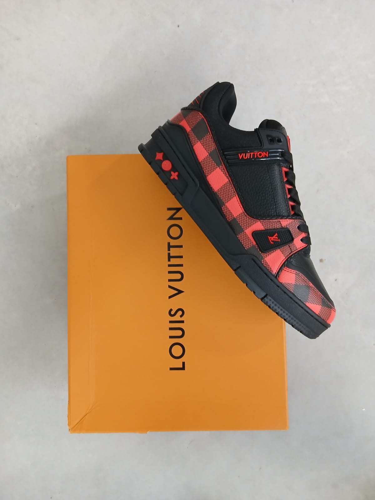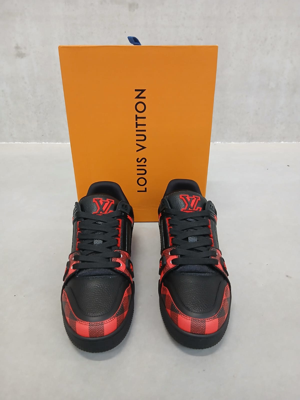 Maatadvies: Louis Vuitton Trainer Leather Low Black Red valt op maat.